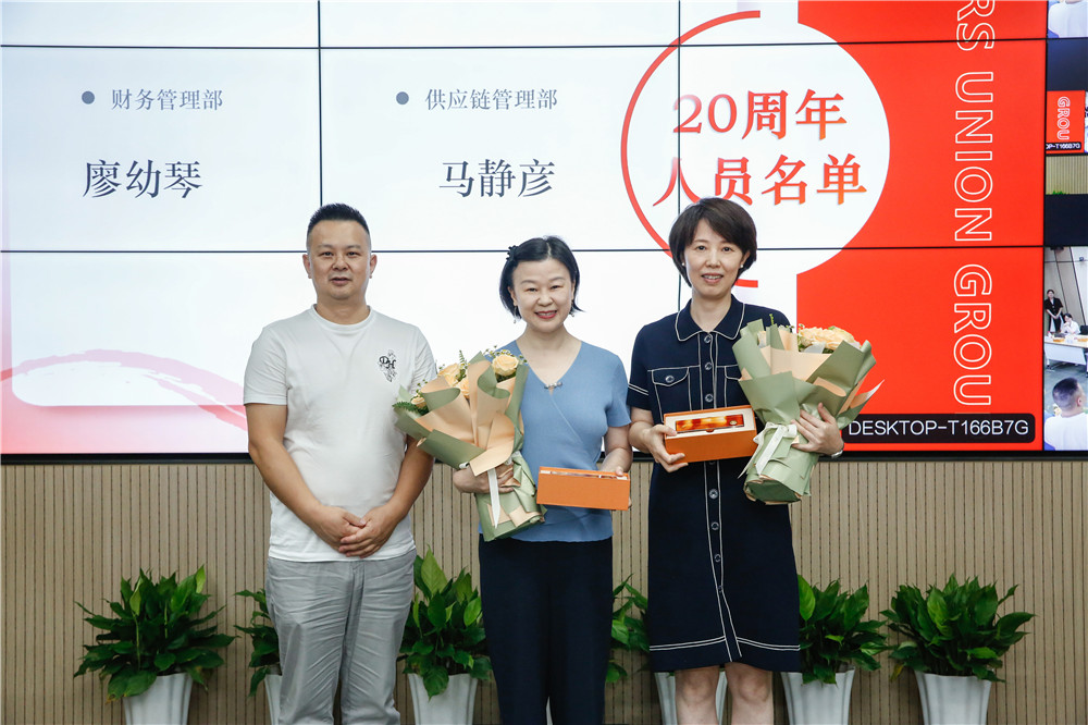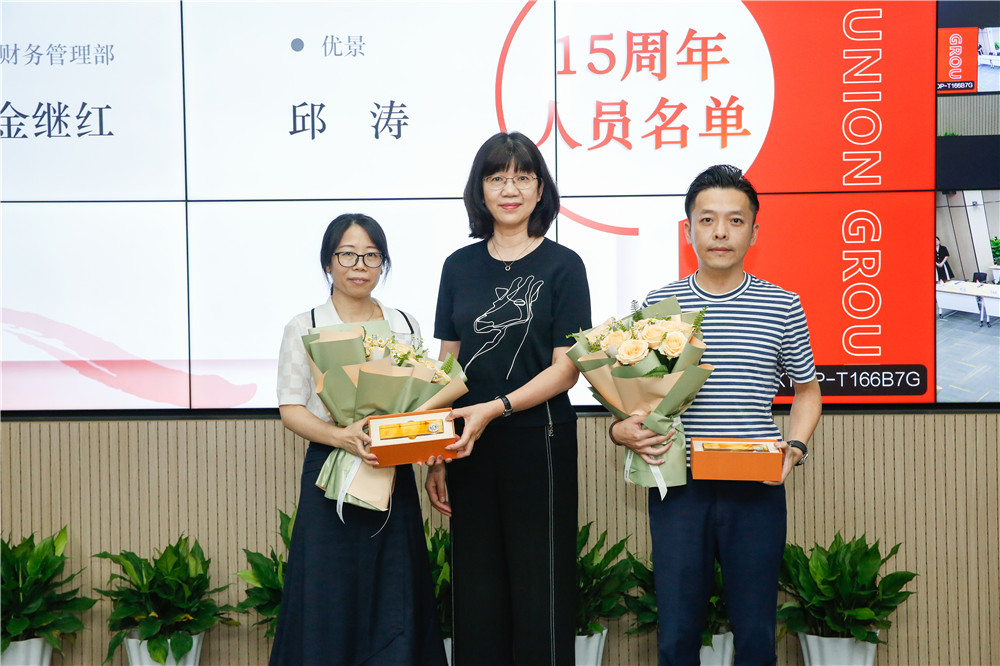 During the event, five representatives of long-service employees, including July Hu, delivered inspiring speeches in terms of various aspects of their journeys working in the Group, such as work experiences, personal growth, and career development. Representing the 5 years of service, Summer Xia from Auland expressed genuine gratitude for the unwavering support received from sister companies within the Group. Chris Yu from Union Home, representing the 10 years of service, shared her experience of being embraced and motivated by colleagues and leaders, expressing her gratitude to the Group. Jane Jin, representing the 15 years of service from the Finance Management Department, emphasized the widespread use of data intelligence within the Group, which has significantly boosted the work efficiency and promoted the Group's rapid growth. Joe Zhao, representing the 15 years of service from Deal Hope Business Division, highlighted the Group's dedication to learning and personal development, citing the wealth of learning resources available within the Group. Finally, representing the 20 years of service, July Hu from Union Chance, expressed her heartfelt appreciation for the trust granted by leaders during her two-decade-long work life. She joined the Group immediately after graduating from university. In the future, she would continue to move forward with greater determination.