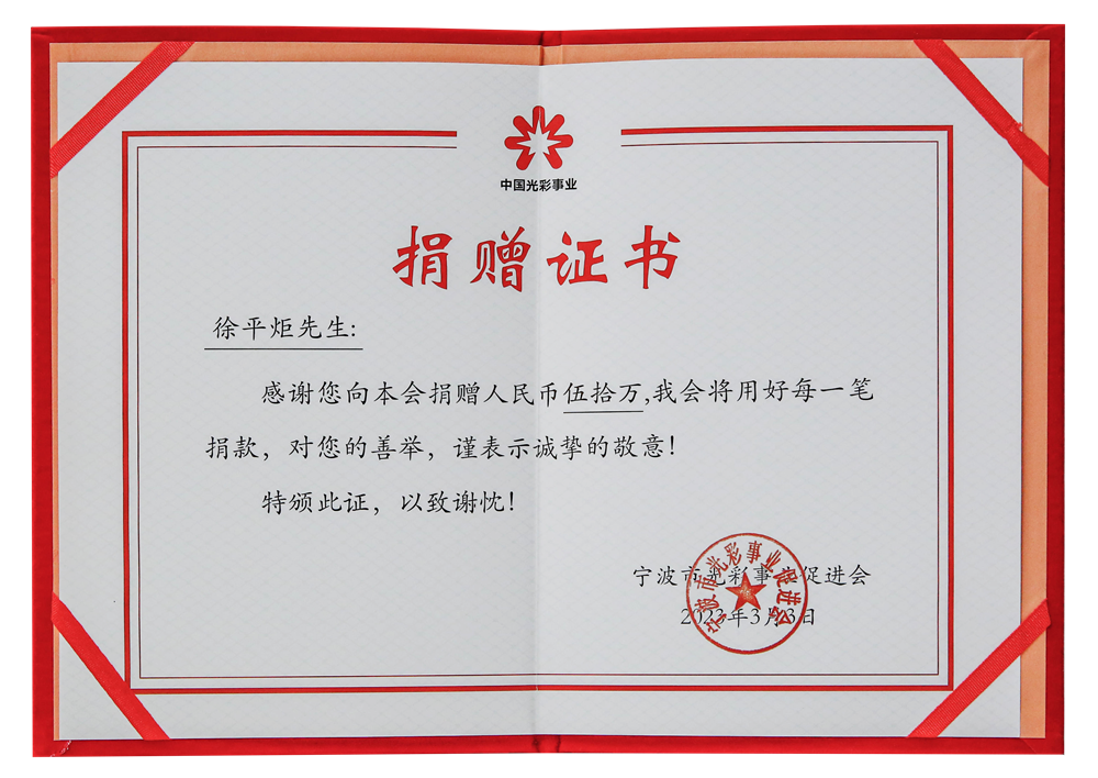 Mr. Xu Pingju, Chairman of the Group, donated 500,000 yuan to support “Guangcai Common Prosperity” Project, together with the joint donations of other member units of Ningbo Society for Promotion of the Guangcai Program, which will be used to fully develop the traditional food with traditional characteristics, cultural connotations and local flavor, actively restore tradition, improve technology and quality, expand sales and promote prosperity. The project will develop traditional characteristic food field first and gradually expand to other fields, and develop Ningbo first and gradually expand to other areas.